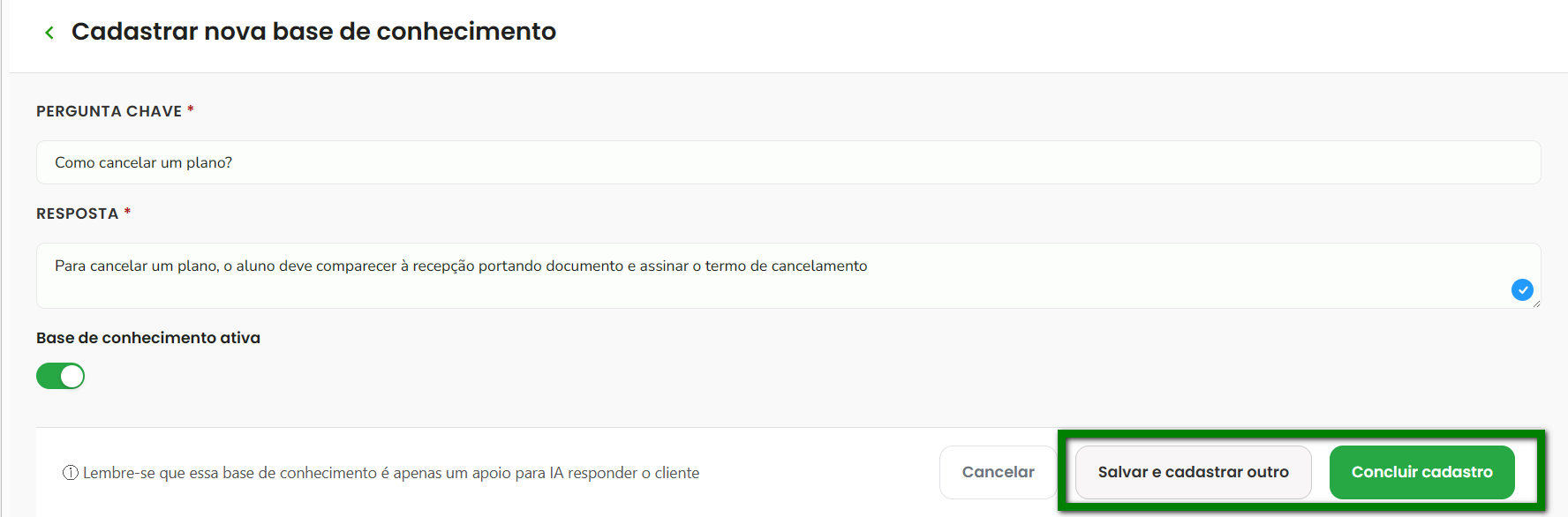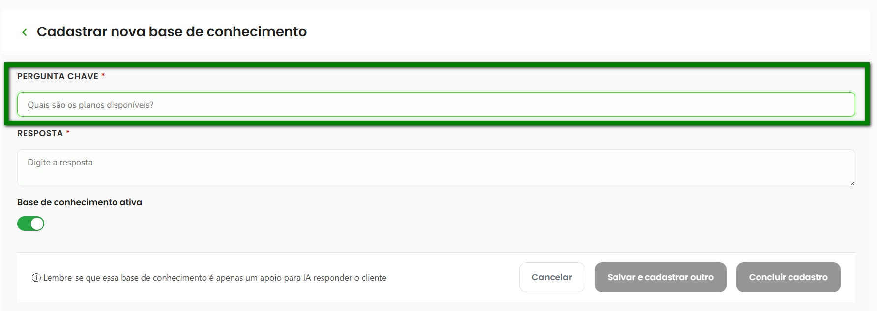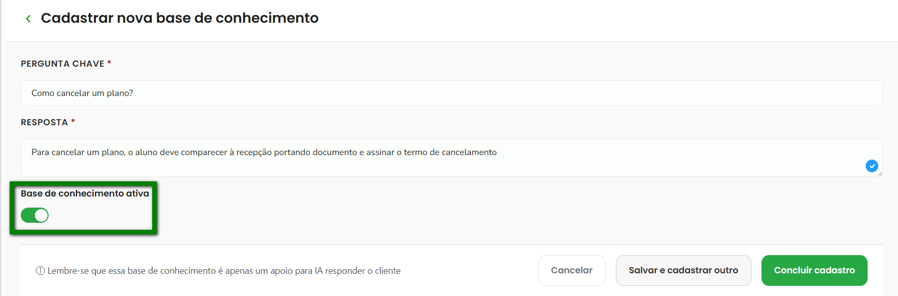 7. Utilize o interruptor “Base de conhecimento ativa” para definir se essa nova base estará disponível imediatamente para uso da IA ou ficará desativada;