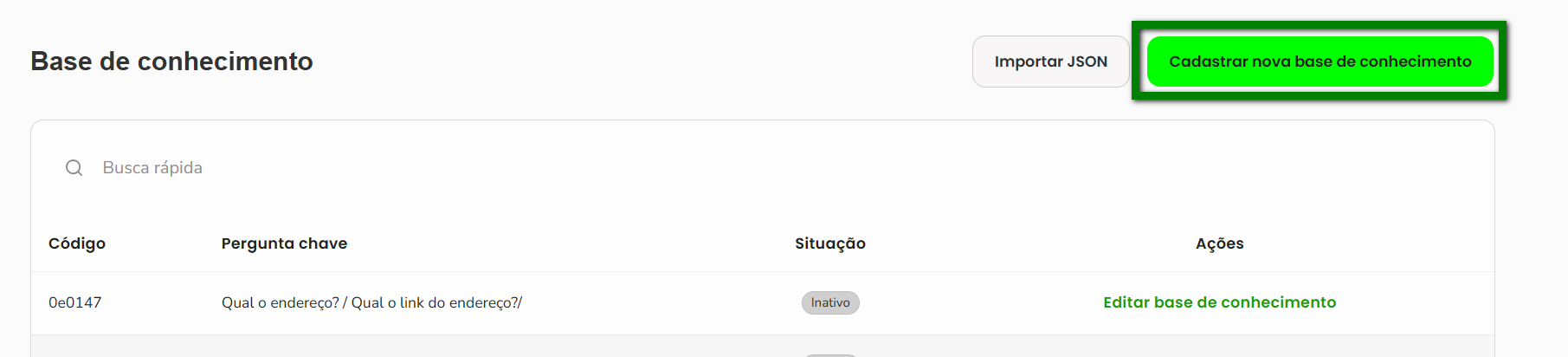 2. Na tela de “Base de conhecimento”, visualize a área onde são listadas todas as bases já cadastradas, incluindo código, pergunta-chave, situação e ações;