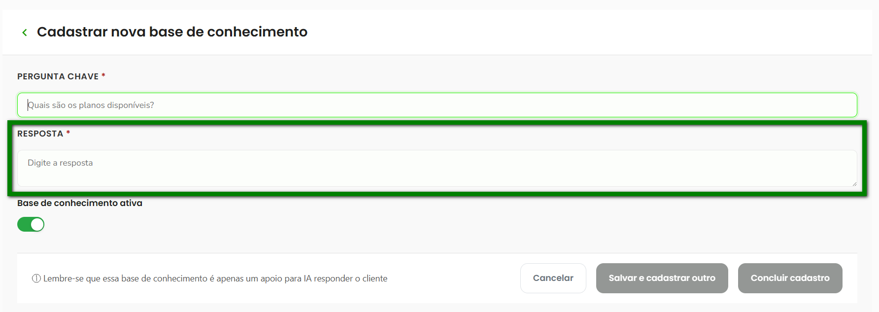 6. No campo “Resposta”, digite a resposta completa que será utilizada pelo assistente virtual ao interagir com o cliente;