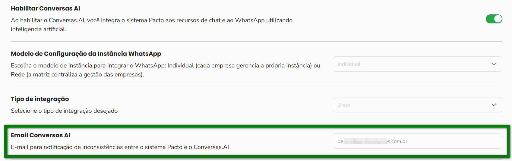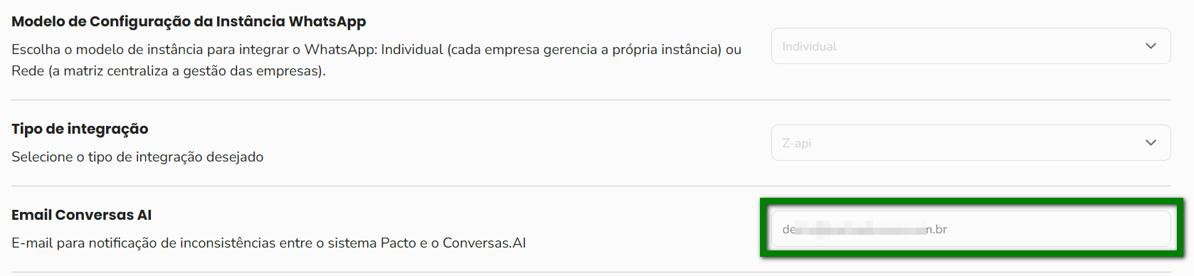 4. No campo “Email Conversas AI”, clique para inserir ou alterar o e-mail que receberá as notificações de inconsistências;