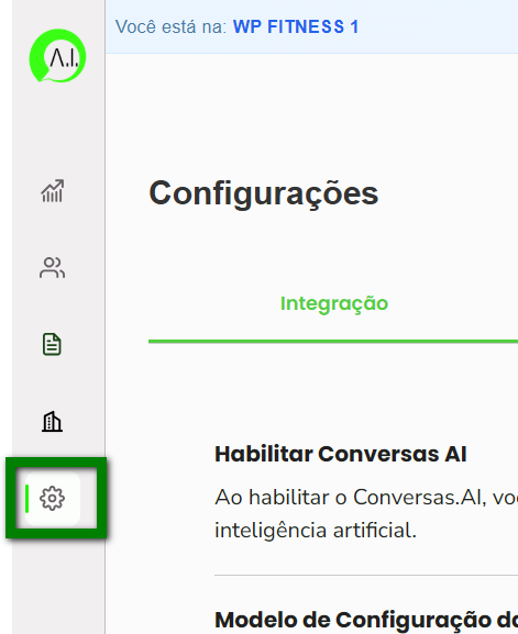 1. No menu lateral, localize e clique no ícone de “Configurações” para abrir as opções relacionadas ao Conversas.AI;