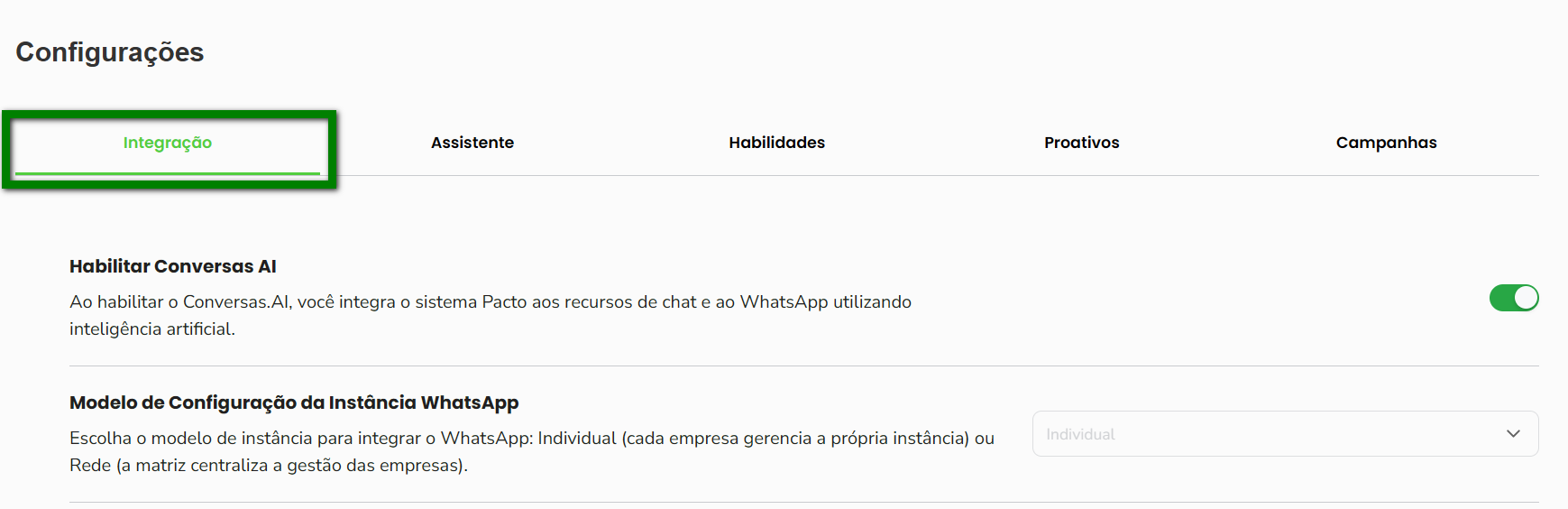 2. Na tela de “Configurações”, clique na guia “Integração” para visualizar as configurações do WhatsApp Business via Gymbot;