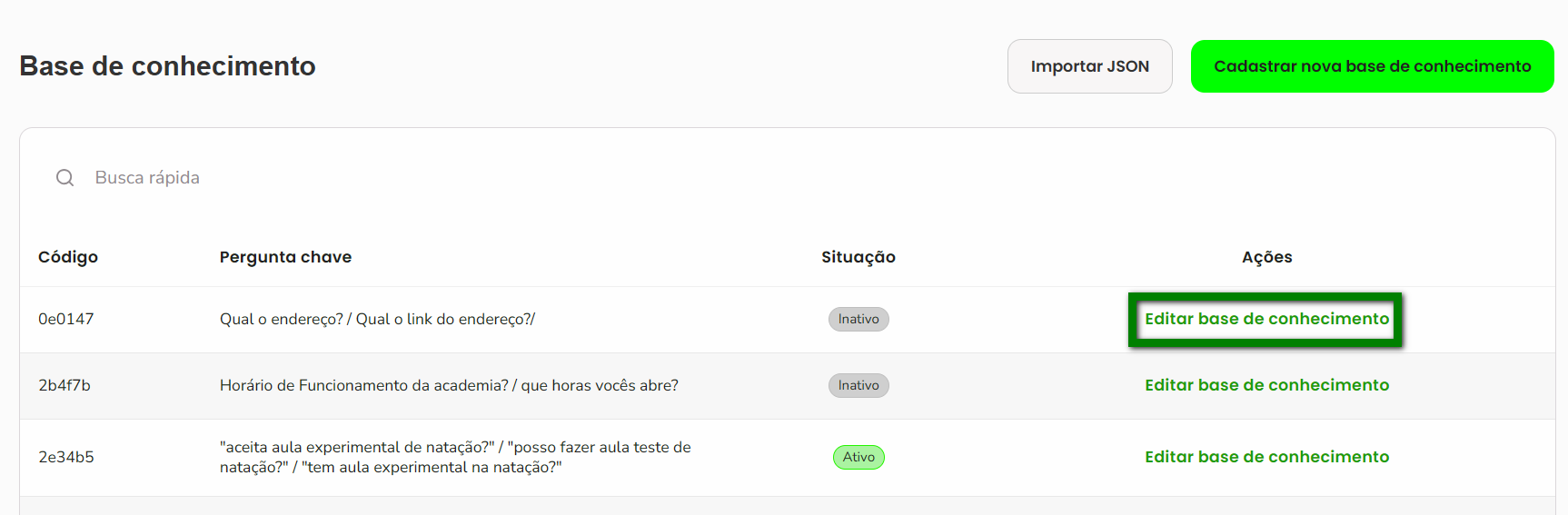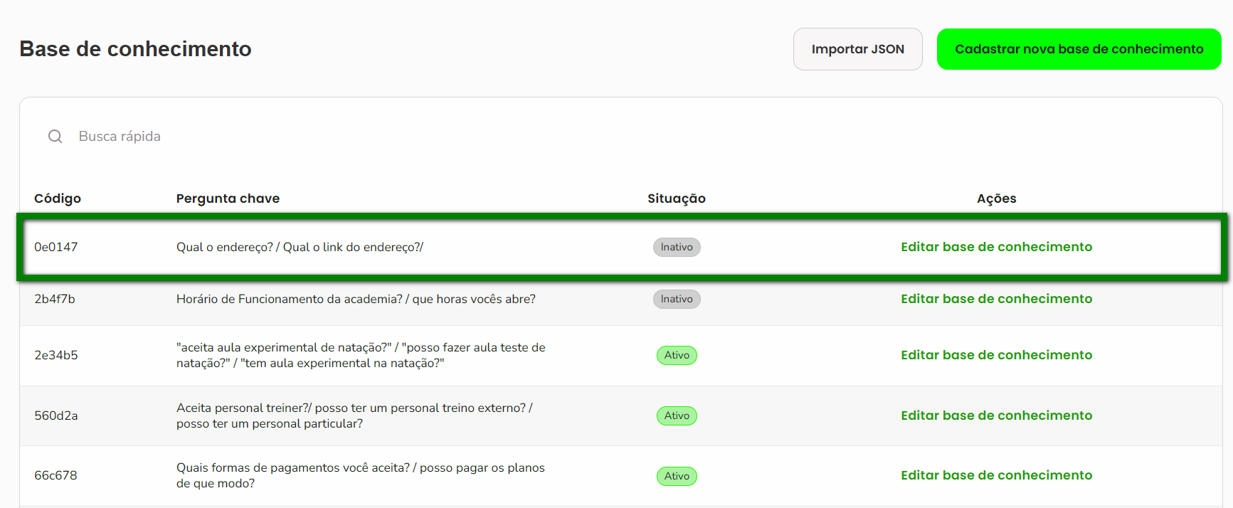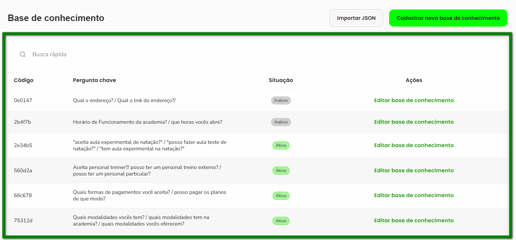 2. Na tela de “Base de conhecimento”, visualize a área onde são listadas todas as bases já cadastradas, incluindo código, pergunta-chave, situação e ações;