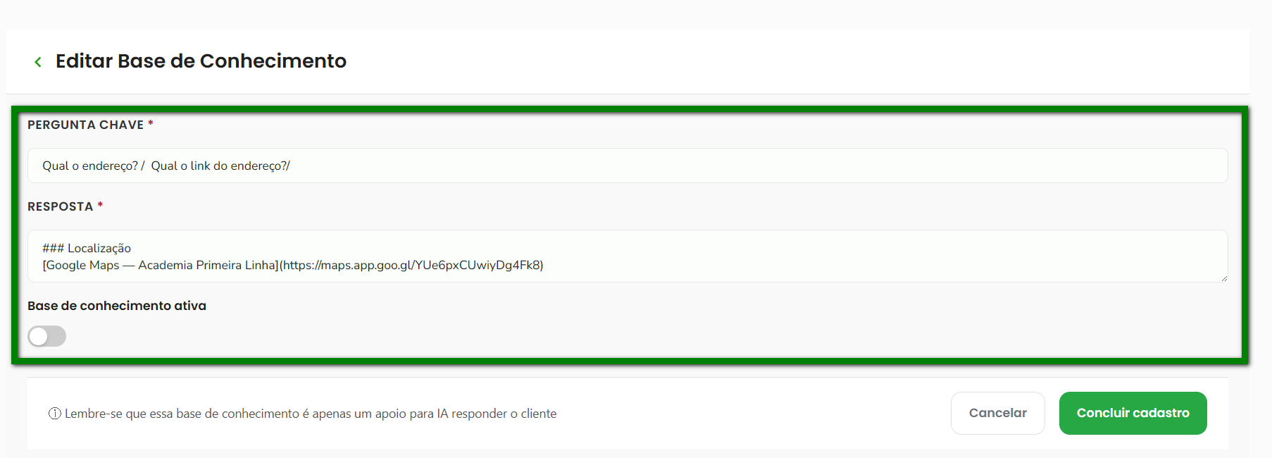 5. Será aberta a tela “Editar Base de Conhecimento”, onde você poderá atualizar os campos “Pergunta chave” e “Resposta”;