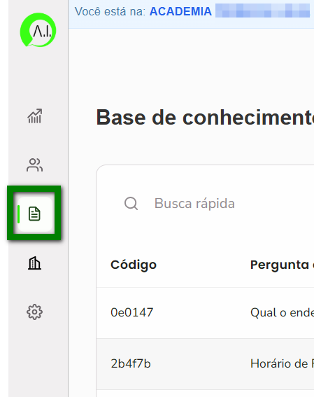 1. No menu lateral, localize e clique no ícone de “Base de conhecimento” para visualizar todas as perguntas cadastradas e acessar as funções de criação e edição;