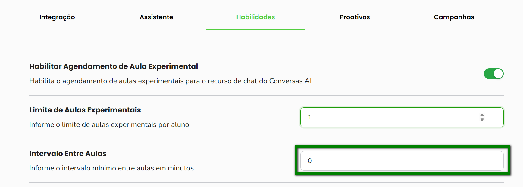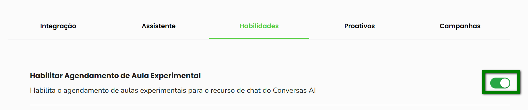 3. Ative a opção “Habilitar Agendamento de Aula Experimental” para permitir que a IA marque aulas experimentais;