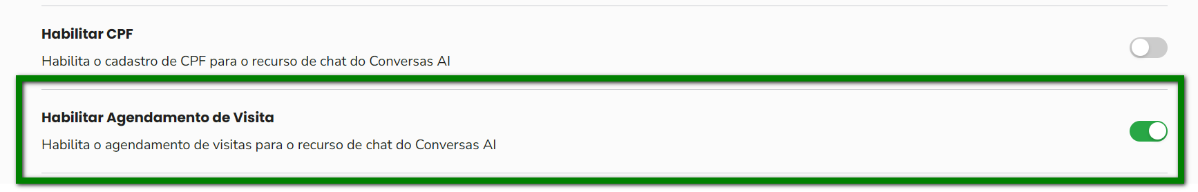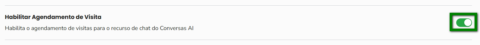 4. Ative o botão exibido ao lado da opção para habilitar o agendamento de visita no Conversas.AI;
