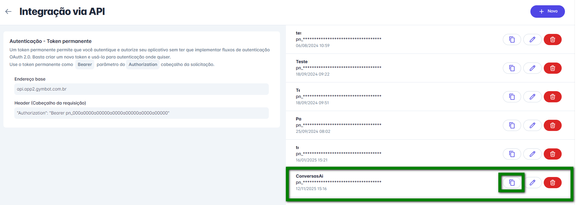 Observação: o “Token“, e copiado de dentro do Gymbot, em “Integração via API“.