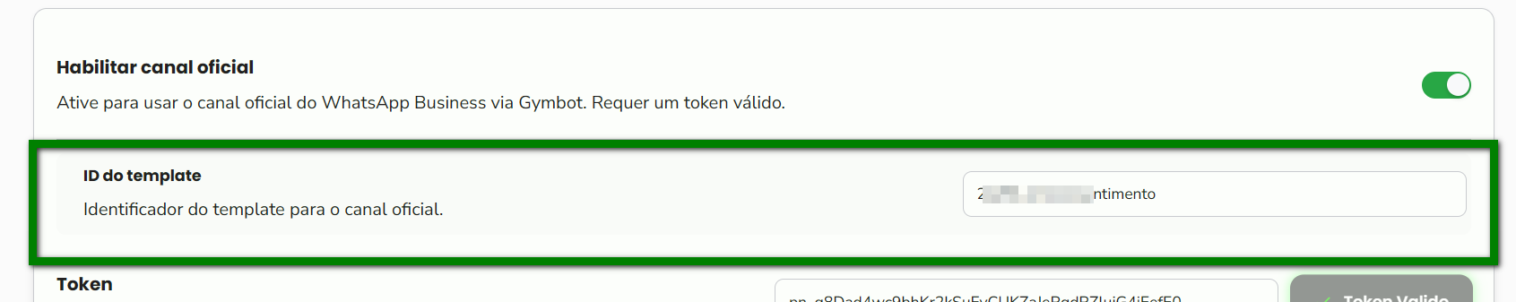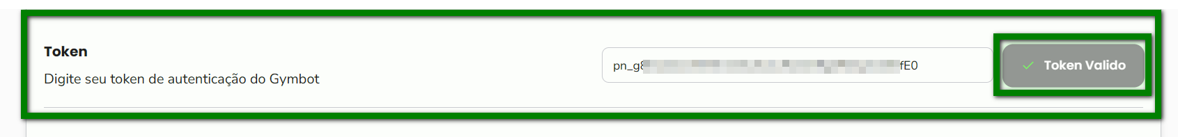 5. No campo “Token”, digite o token de autenticação fornecido pelo Gymbot para validar o uso do canal oficial, em seguida clique “Token Valido“;