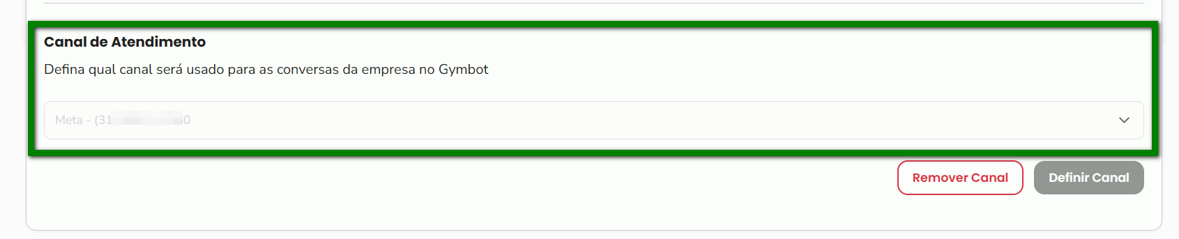 6. No campo “Canal de Atendimento”, selecione qual canal autorizado será usado para as conversas do Conversas.AI no Gymbot, e clique no botão “Definir Canal” para confirmar as configurações do canal oficial;