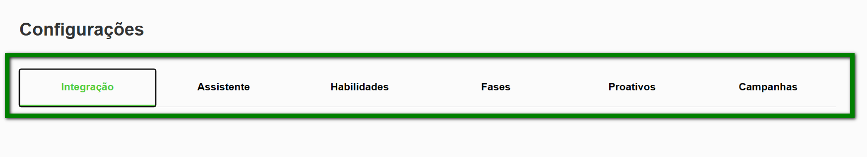 A navegação entre as seções de configuração do Conversas.AI permite acessar e ajustar diferentes recursos do sistema, como integrações, comportamento do assistente, habilidades, fases de atendimento, ações proativas e campanhas.