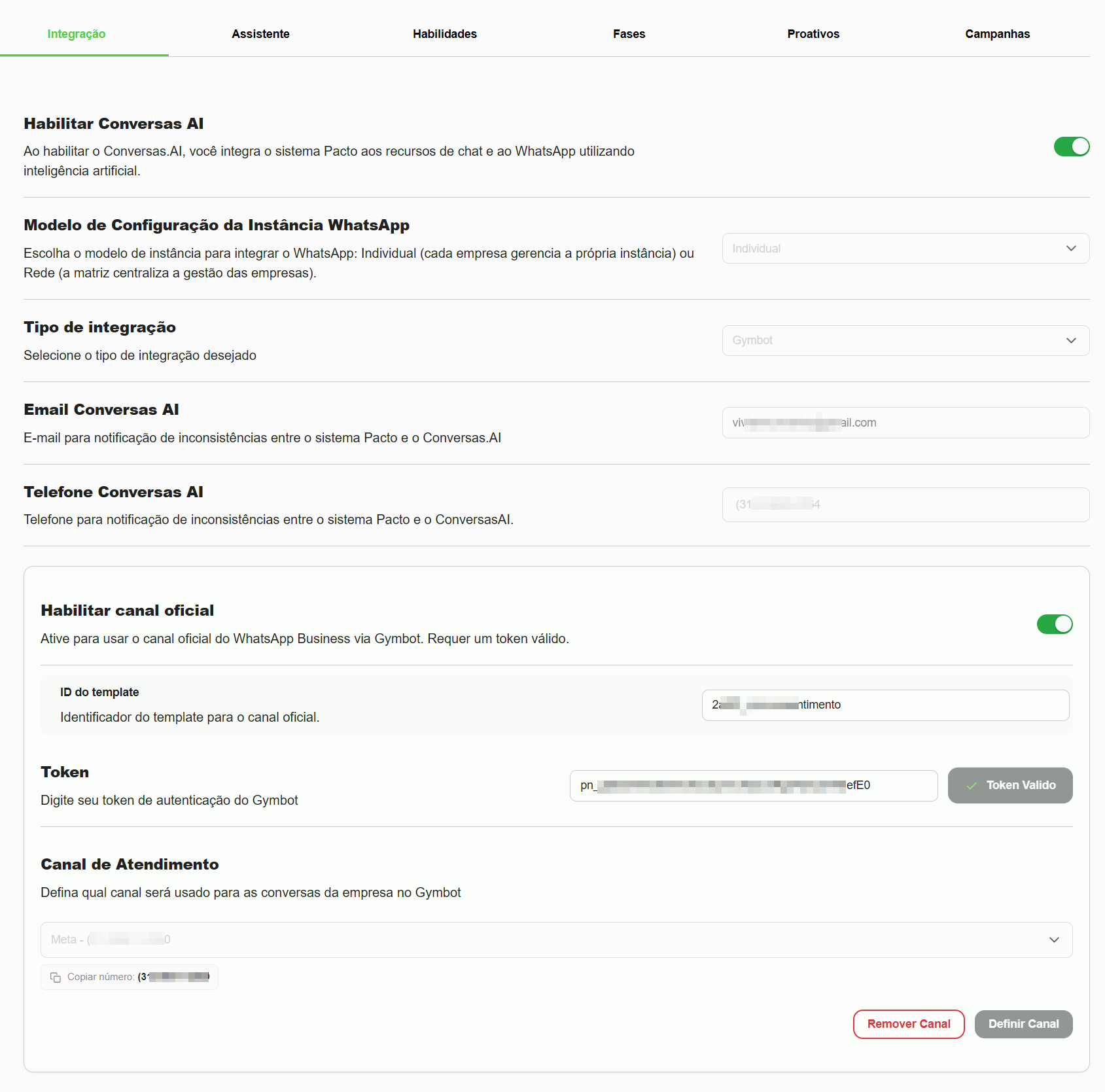 Número de telefone usado para notificações de inconsistências entre o sistema Pacto e o Conversas.AI. - Habilitar canal oficial