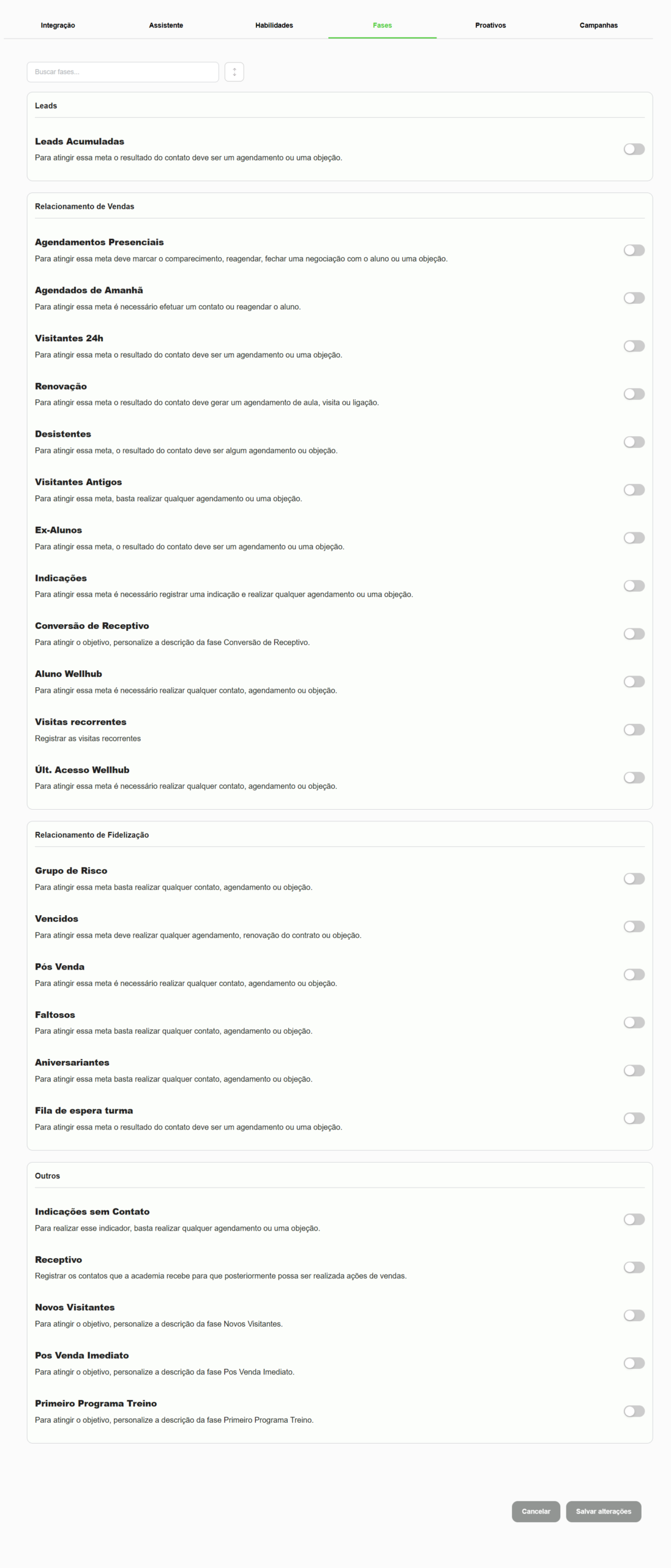 6. Na seção “Fases” serão apresentado as opções para configurar as fases do CRM do fluxo de atendimento Ativo da IA;