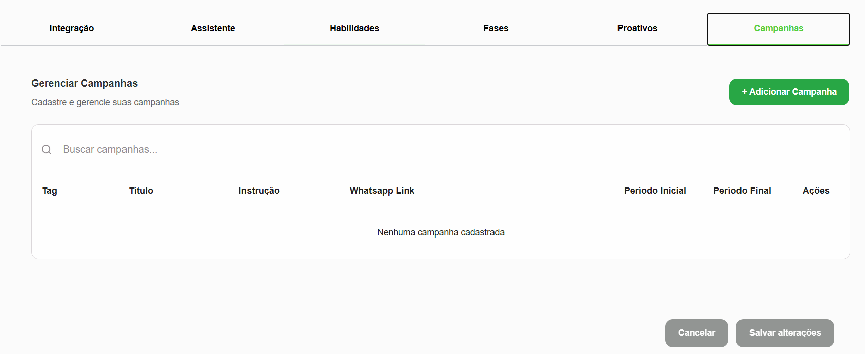 8. Na seção “Campanhas” para criar, editar e gerenciar instruções que a I.A deve executar quando o cliente vier por alguma campanha especifica com mensagens programadas e palavras-chave.